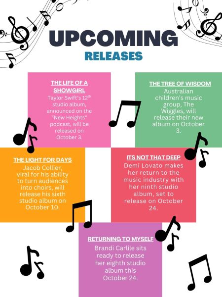 The most notable upcoming release for this month would have to be Taylor Swift’s anticipated 12th studio album, “The Life of a Showgirl.” The album consists of 12 tracks, one of which having a Sabrina Carpenter feature. A New York City pop-up, containing so many meticulously curated easter eggs, has recently opened and will remain until the day before the album release on October 3.